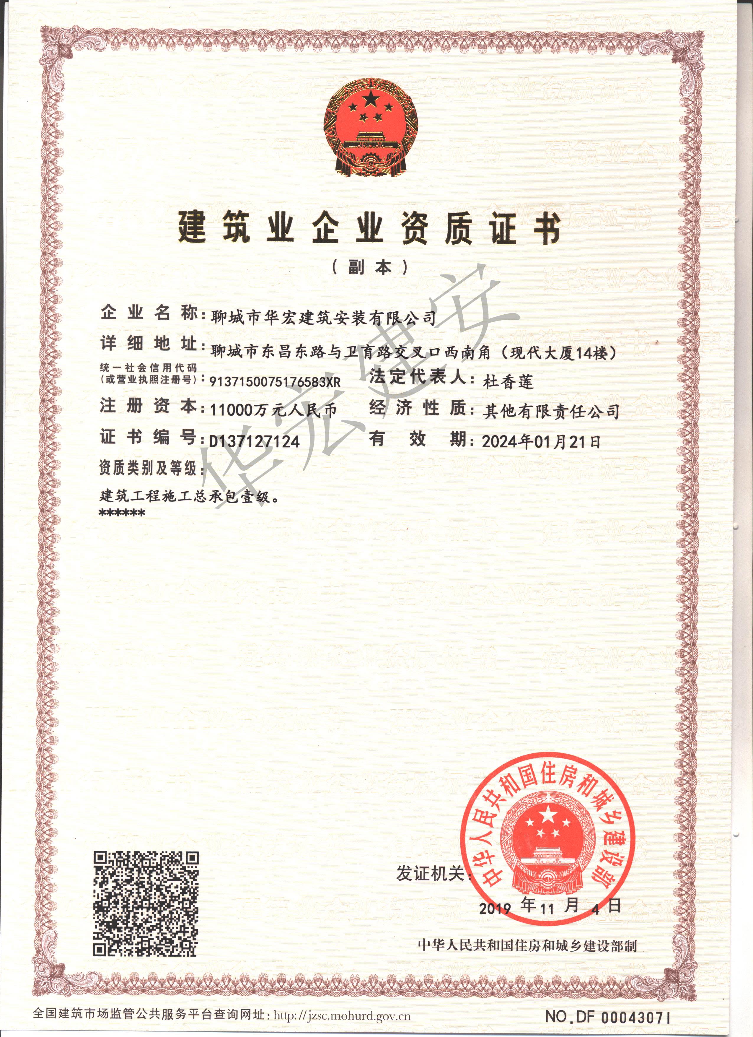 聊城市華宏建筑安裝有限公司成立于2002年5月,公司自2002年成立以來,不斷發揚 “敬業修身 打造精品 開拓創新 弄潮勇進”的創業精神,始終遵循“以質量求生存、靠精品創品牌、憑信譽贏市場”的宗旨,認真奉行“科學 高效 一流”的質量方針
